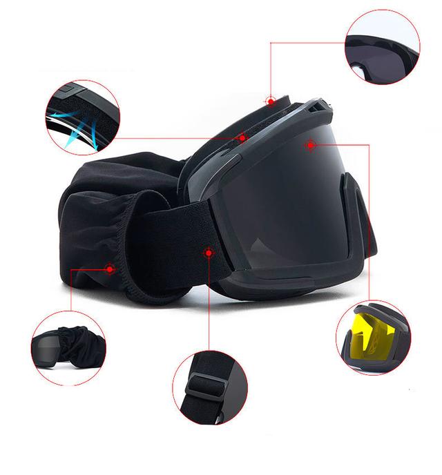 • Лінзи знімні, різного кольору — під різні умови освітлення. З гнучкої рамки не становитиме проблеми вийняти лінзу, теж досить еластичну, і вставити нову до клацання. Важливо простежити за тим, щоб усі елементи встали у свої пази. Темні окуляри ідеальні для ясної погоди. Жовті покращують контрастність у похмуру погоду, у них простіше прицілюватися. Прозорі виручать, коли освітлення недостатнє.